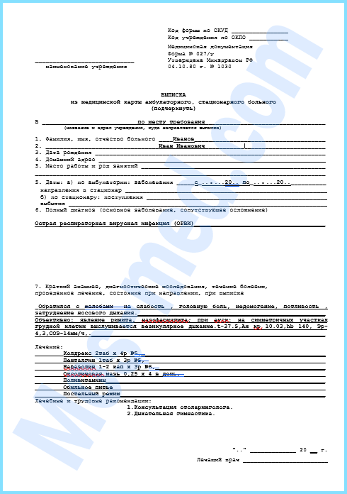 - Подтверждение болезни на работе — работодатели в Москве часто требуют выписку 027/у вместо обычной справки о болезни для подтверждения длительного отсутствия.
